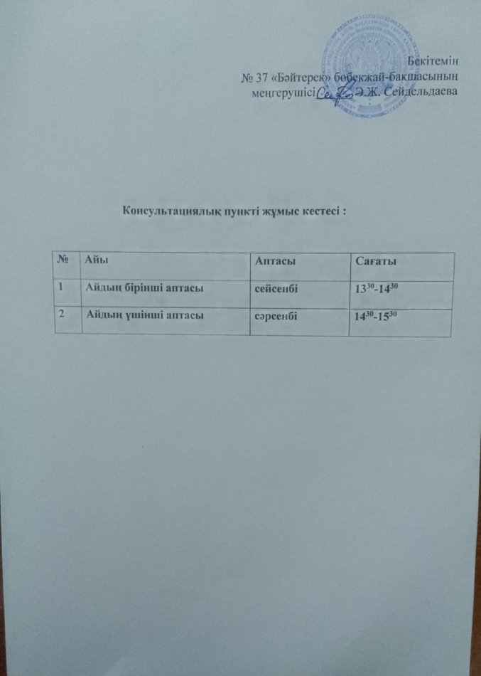 Консультациялық пункттің құрамы » №37 "Бәйтерек" бөбекжай-бақшасы