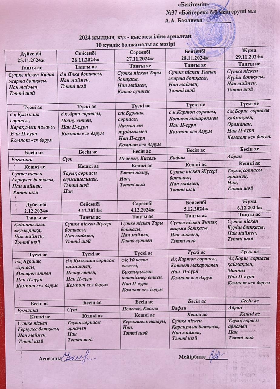 2024 жылдың күз мезгіліне арналған 10 күндік болжамалы ас мәзірі » №37 "Бәйтерек" бөбекжай-бақшасы