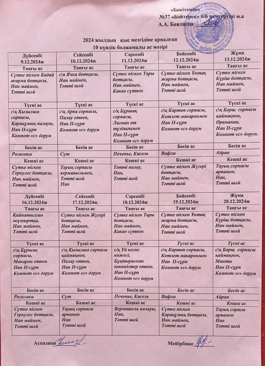 2024 жылдың қыс мезгіліне арналған 10 күндік болжамалы ас мәзірі » №37 "Бәйтерек" бөбекжай-бақшасы