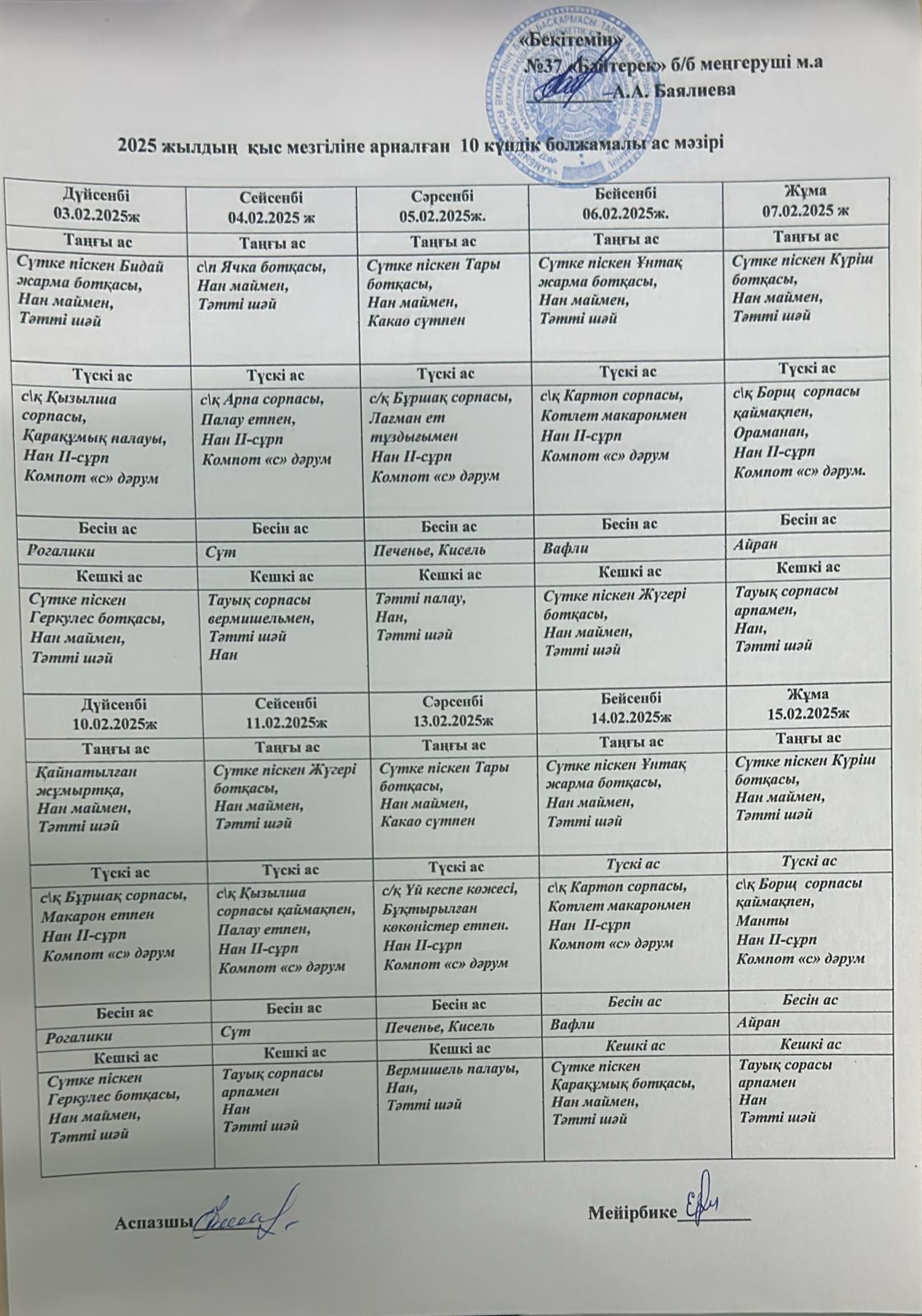 2025 жылдың қыс мезгіліне арналған 10 күндік болжамалы ас мәзірі » №37 "Бәйтерек" бөбекжай-бақшасы