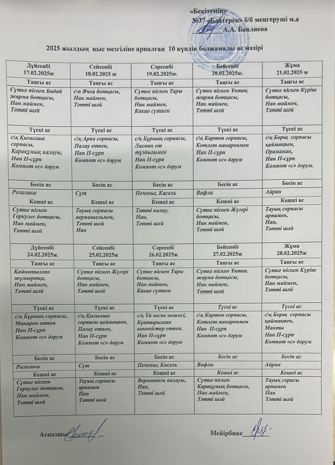 2025 жылдың қыс мезгіліне арналған 10 күндік болжамалы ас мәзірі » №37 "Бәйтерек" бөбекжай-бақшасы