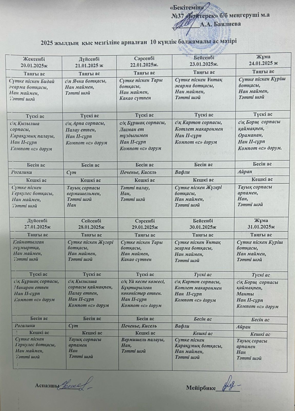 2025 жылдың қыс мезгіліне арналған 10 күндік болжамалы ас мәзірі » №37 "Бәйтерек" бөбекжай-бақшасы