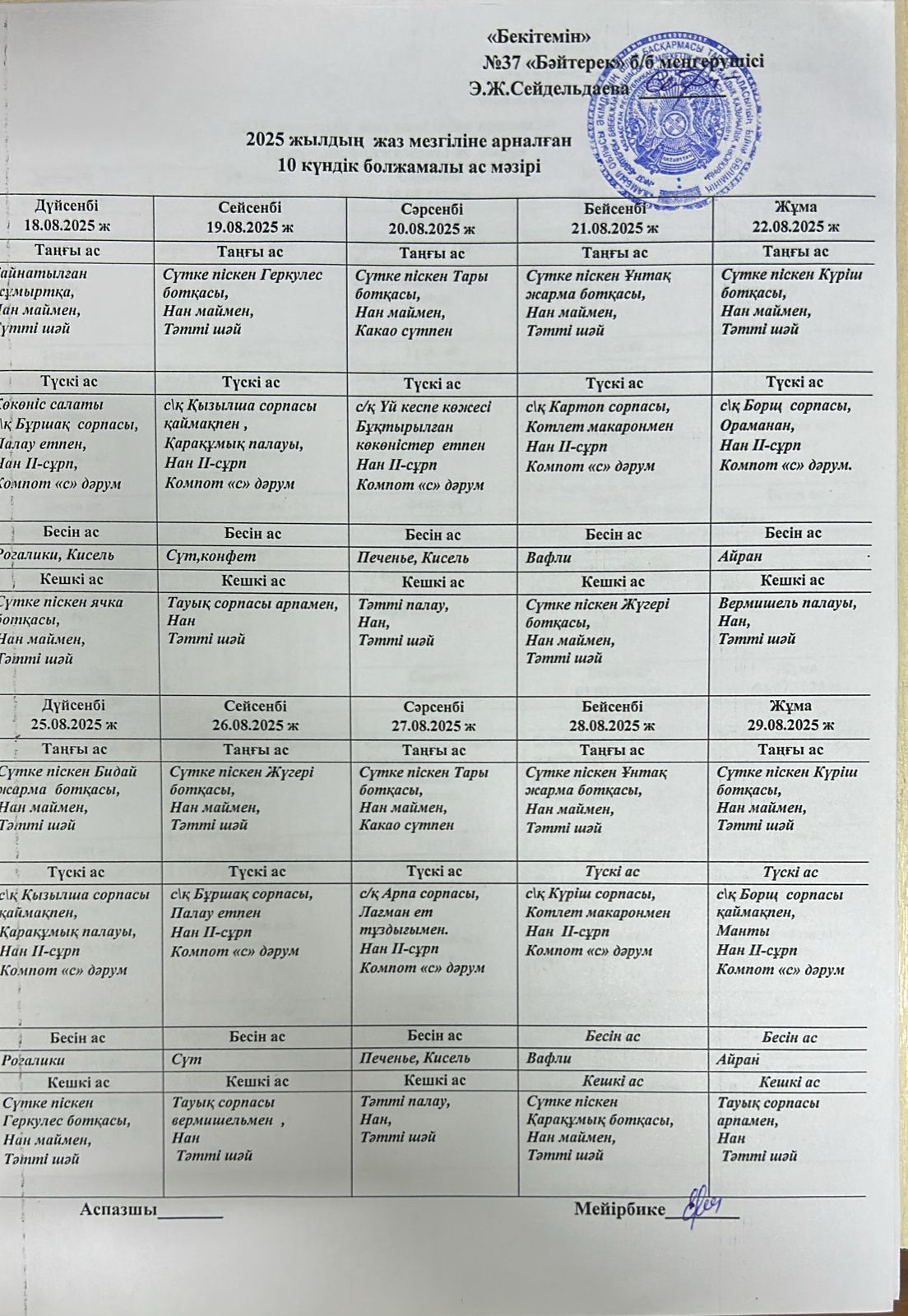 2025 жылдың жаз мезгіліне арналған 10 күндік болжамалы ас мәзірі » №37 "Бәйтерек" бөбекжай-бақшасы