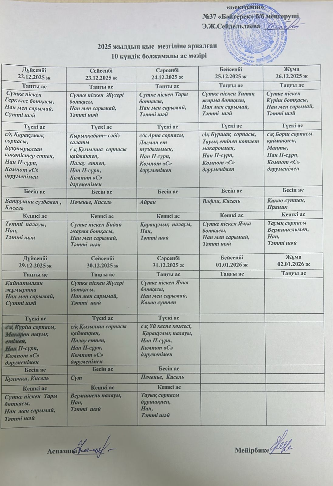 2025 жылдың қыс мезгіліне арналған 10 күндік болжамалы ас мәзірі » №37 "Бәйтерек" бөбекжай-бақшасы